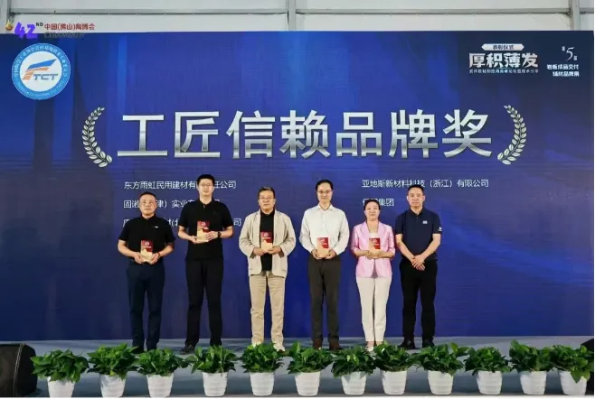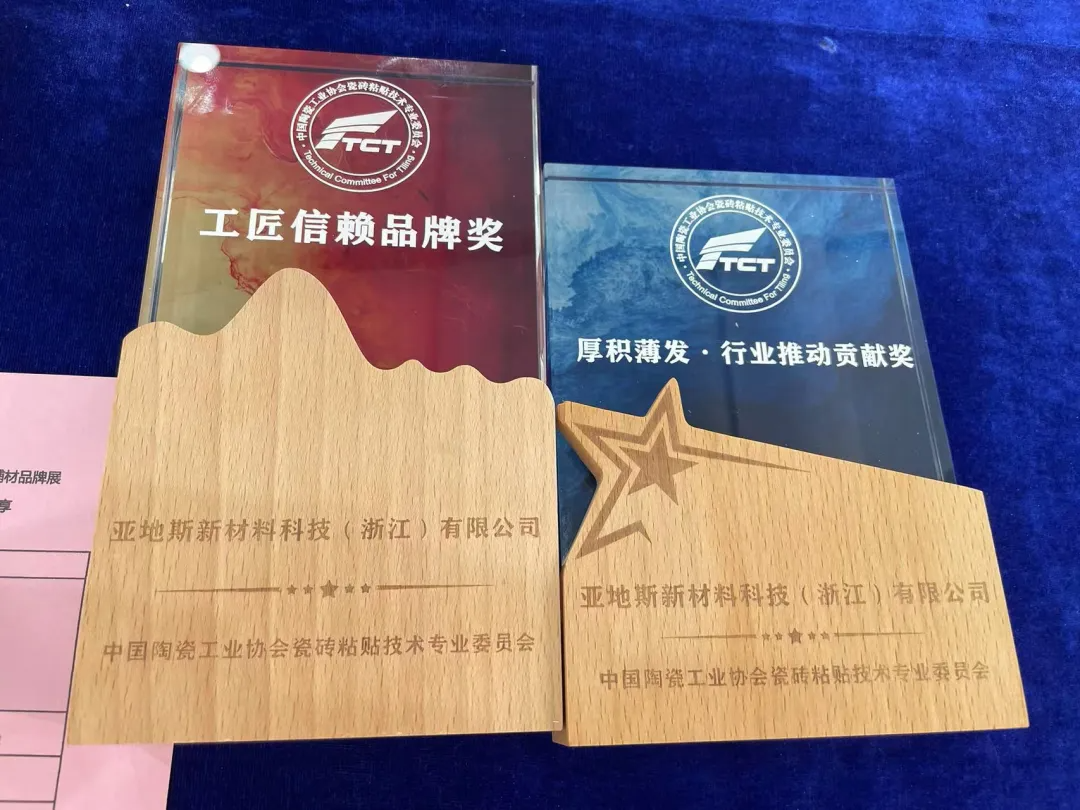 在兩次活動(dòng)中亞地斯新材料科技(浙江)有限公司分別連續(xù)斬獲工匠信賴品牌獎(jiǎng)和行業(yè)推動(dòng)貢獻(xiàn)獎(jiǎng)及首屆工長推薦找平材料品牌獎(jiǎng)。