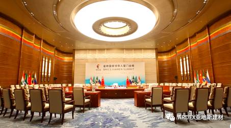 值得一提的是,五國大范圍會議室的主背景墻上6.75米高處,宋代名窯之一的德化瓷被做成了金磚五國國花的造型“貼”在了墻上。瓷磚膠正是采用了亞地斯(ARDEX)的輔材產(chǎn)品。