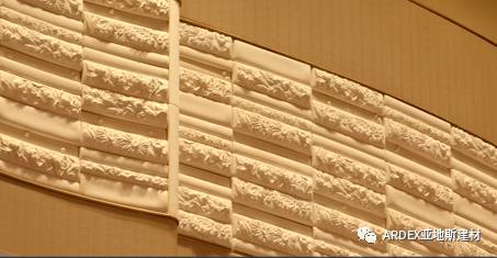 經(jīng)過迎賓長廊,步入迎賓大廳,6根異型石柱映入眼簾,柱面石材雙曲造型與吊頂竹節(jié)弧形雕刻鋁板相互延伸。柱面石材鋪貼也是采用了亞地斯(ARDEX)的輔材產(chǎn)品。